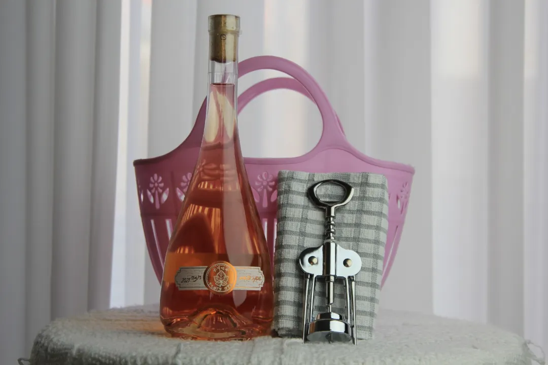 מארז הכולל יין רוזה, מפית, פותחן וסל.