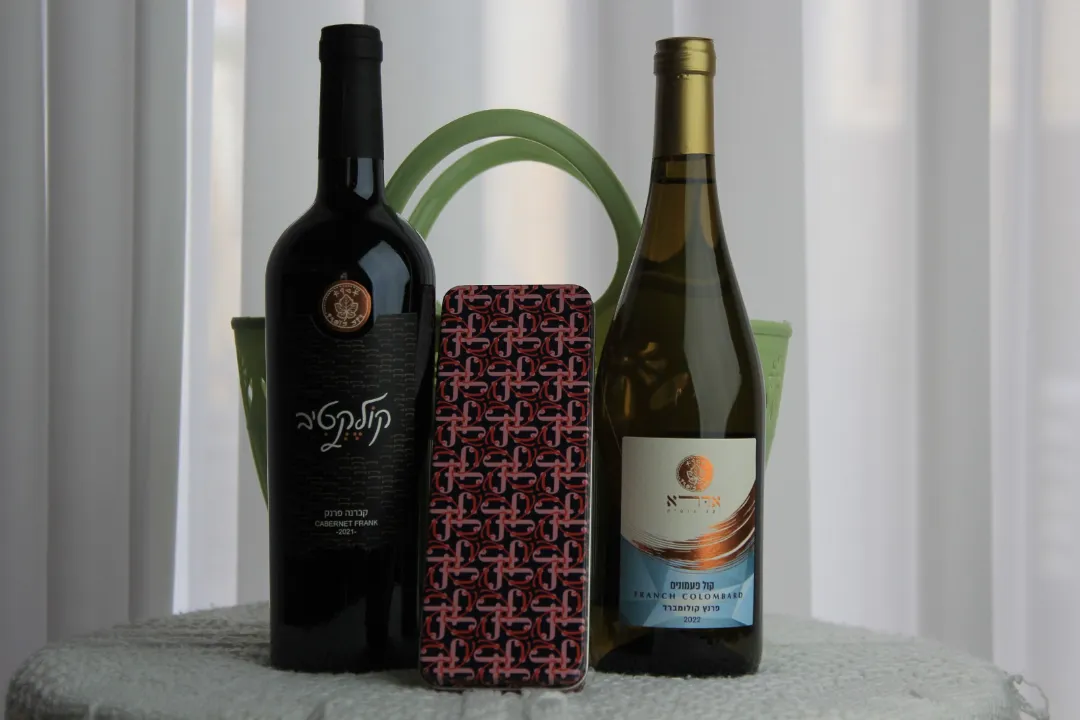 מארז הכולל יין פרנץ קולומברד, יין קברנה פרנק ושוקולד.